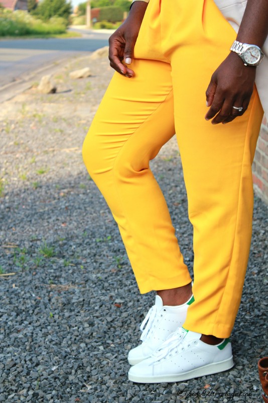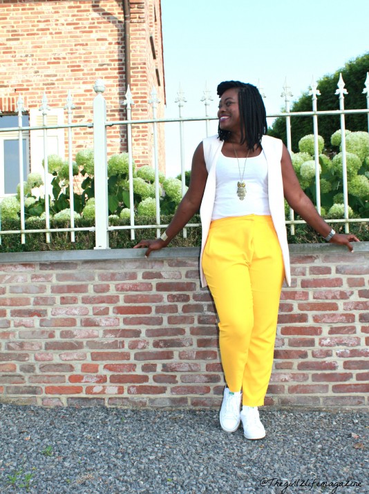 Pour ce look, j’ai choisi de l’associer à un pantalon de couleur plus vive choppé il y a un an dans la rue neuve.